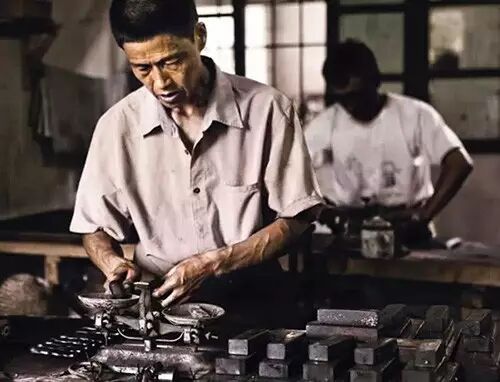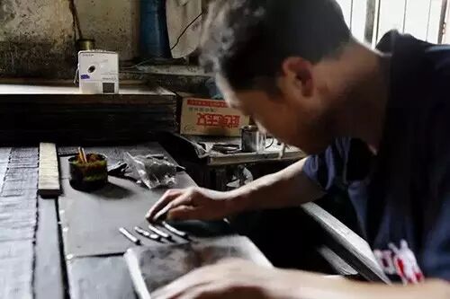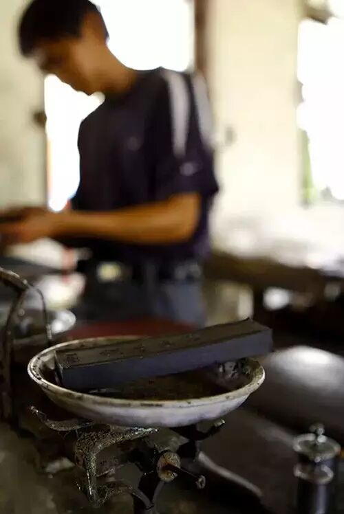 第二道工序是配料、拌料、成型。 將油煙灰與其它輔料有金箔、珍珠、麝香等各種名貴藥材,再按比例配以某種膠料作為載體加以拌和。 料拌好後,就像做饅頭那樣,把一大團墨放在案板上不斷地揉,並用一塊鋥亮的金屬方錘不斷地敲打,把這團墨揉敲到一定的細潔和柔軟時,就把這團墨按墨錠的重量分成若干小墨團,案板上有一台天平秤,每粒小墨團都上秤稱過。