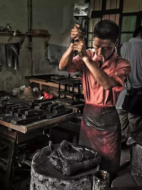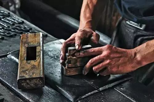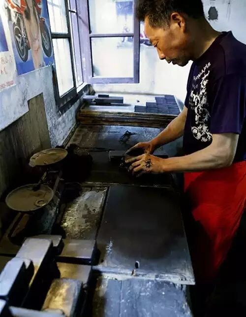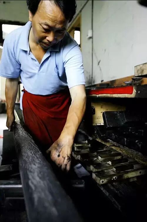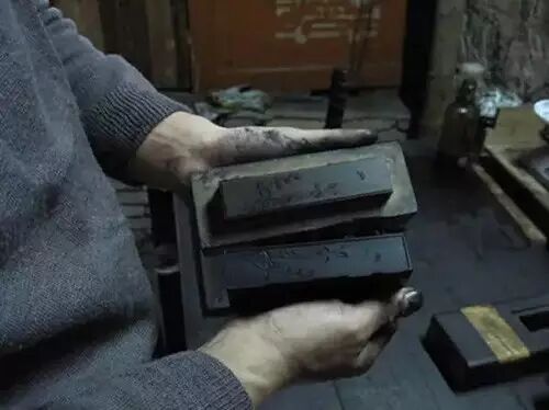 接著就是成型。 把小墨團按墨錠的外形,搓成長條或其它形狀後,放在墨板內加壓成型。 原始的加壓方法是把墨板放在一隻作凳上,再用一根長約三公尺、十公分見方的硬木作為扛桿,工人就坐在硬木的一端加壓,一面加壓,一面在案板上把第二錠墨放進墨板,再從作凳上拿出笫一塊墨板,放入第二塊墨板,如此反复操作。 從墨板中拿出來的墨,是已成形的毛坯墨。